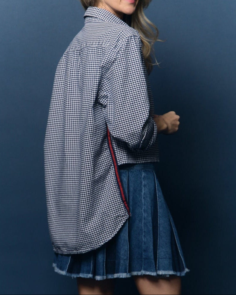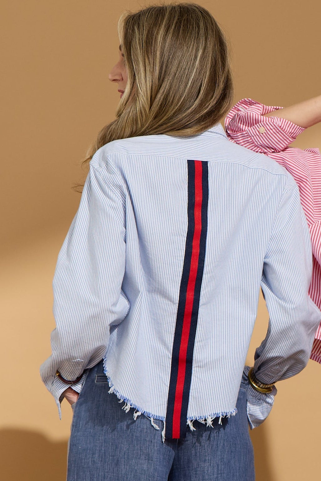 Shop StormyDesigned to move with you, The Stormy redefines balance and edge. Featuring a cropped front that transitions into an elongated back, this high-low silhouette adds unexpected drama to a classic button-down. The finished hem and our signature grosgrain ribbon keeps it sleek.