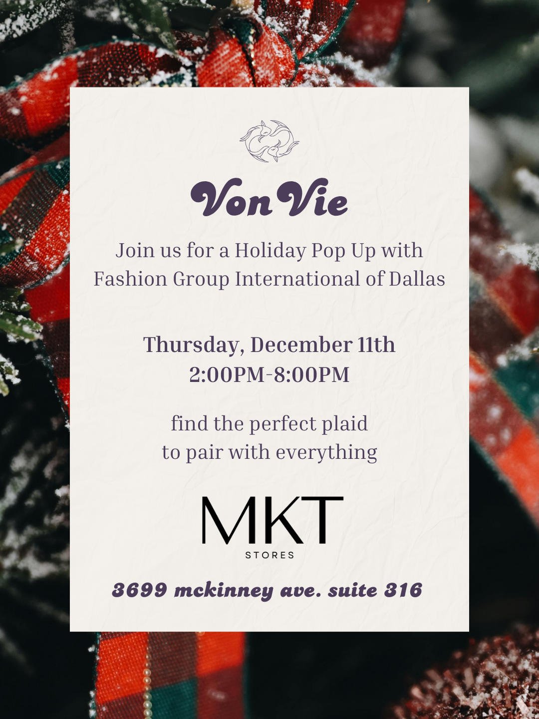 Join us Thursday, December 11th along with Fashion Group International of Dallas for a Holiday Party and Pop Up and MKT Stores in the West Village! We will have drinks and Christmas plaids for all to wear and share!